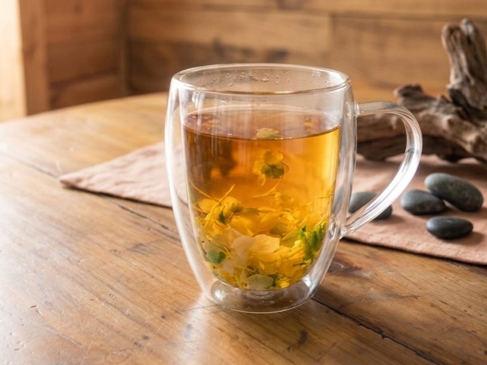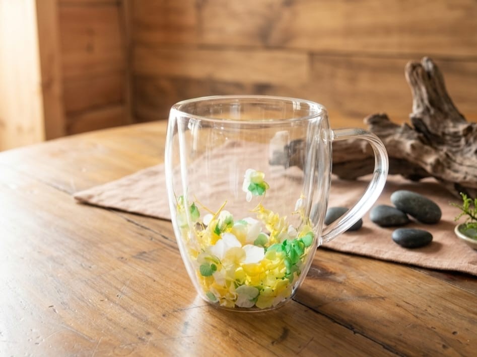 Tasse en verre borosilicate élégante et résistante, ornée de délicates fleurs jaunes et vertes intégrées dans la paroi. Elle apporte une touche florale et apaisante à chaque pause thé. Idéale pour un moment de douceur ou comme cadeau raffiné